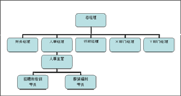 A公司的人事经理对Jenny的表现非常满意,当天就给了offer。Jenny以为今天下午的面试会和上次一样,但是这回她想错了。同样是开场的3分钟自我介绍之后,B公司的人事部经理并没有和Jenny想象的那样以抽取题库的问题进行提问,而是要求Jenny把自己公司和人事部的组织结构图在白板上画出来(下面是Jenny所画的组织结构图)。